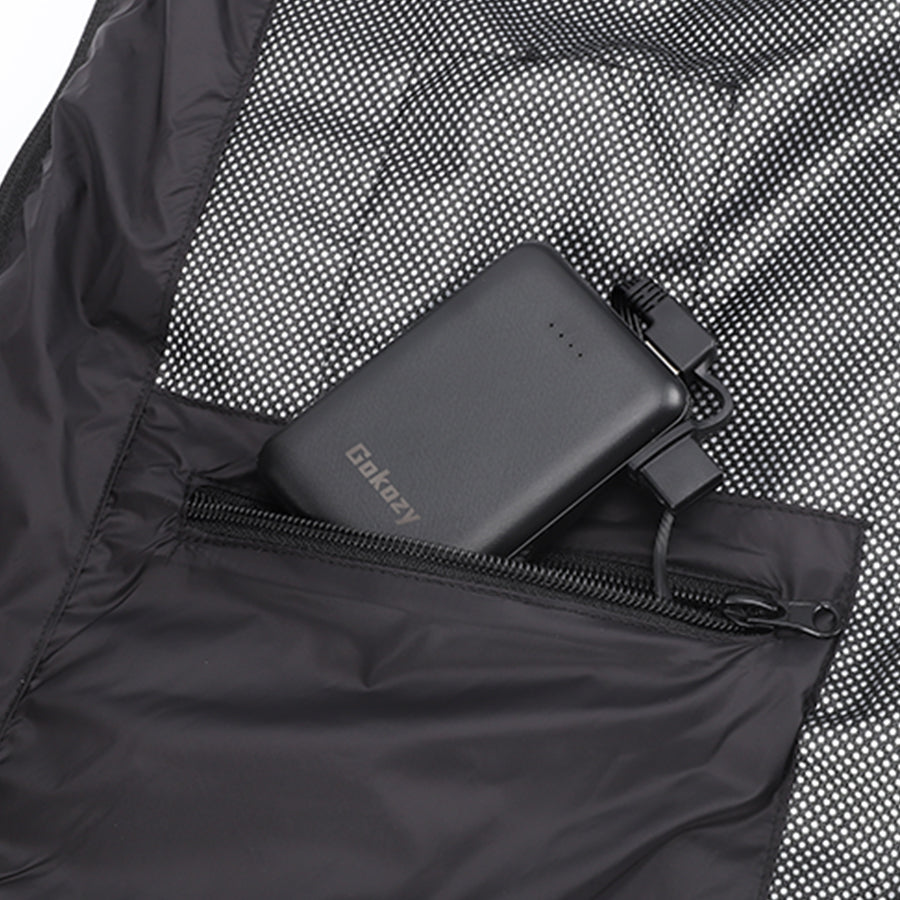 - 5 Carbonfaser-Heizelemente – in den linken und rechten Taschen, im Kragen, oberen Rücken und Lendenbereich – spenden angenehme Ganzkörperwärme und gezielte Unterstützung für den unteren Rücken.